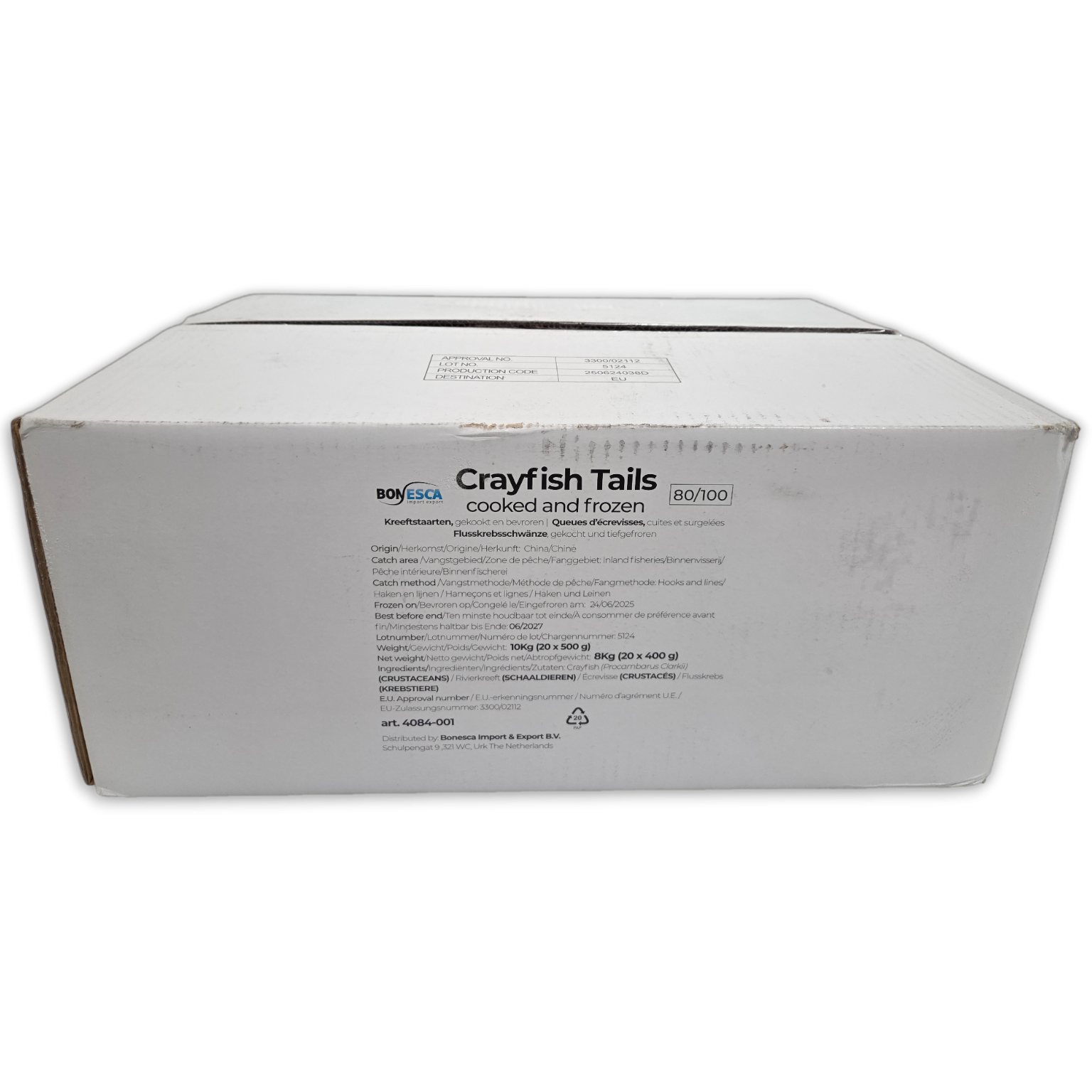 Article number 4084-001 Product Specification 0 Weight 10.00 Consumer Units per box 20 Per pallet 52 Soort Palet EUR Scientific name Procambarus clarkii zoekcode 26PRC EAN Code Box No EAN Code Retail 0 Brand No Statistical code 03061910 Origin China BBD (Batch & Pallet Info) 06/24/2027 00:00:00 CU (Consumer Unit) Dimensions 0 SU (Sales unit) Dimensions 0 Common Names No Synonyms No - Reviews