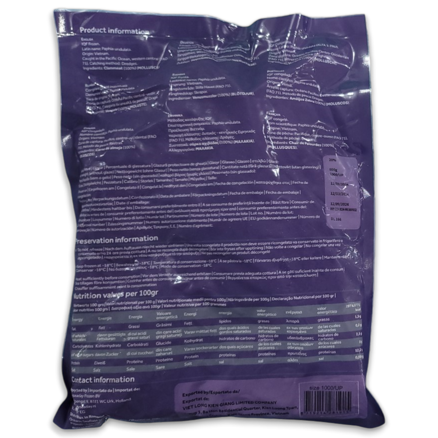 DSD Cooked Yellow Clam Meat 1000-UP IQF 10 x 1kg 20% -VN - Extra informatie
