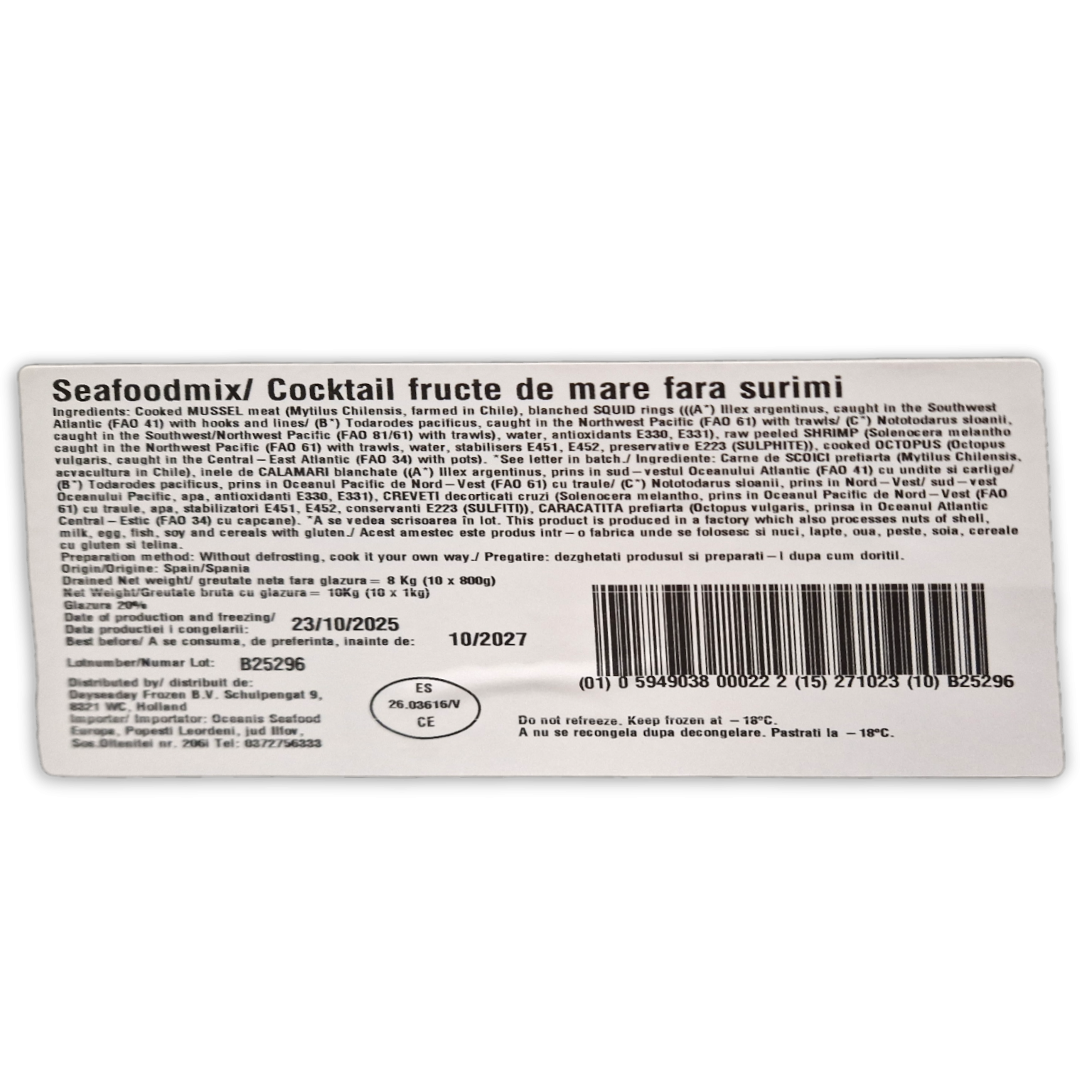 Numéro d'article 6810-001 Spécification du produit 0 Poids 10.00 Unités de consommation par boîte 10 Par palette 64 Soort Palet EUR Nom scientifique Seafood mix zoekcode 47SFM EAN Code Boïte Non EAN Code Retail 8719214287412 Marque Non Code statistique 03079200 Origine Spain DLUO (Infos Lot & Palette) 92367-6810-001 (23-10-2026) Dimensions de l'unité de consommation (CU) 300 x 220mm SU (Unité de vente) Tailles 360 x 284 x 116mm Noms Communs Non synonymes Non - Commentaires