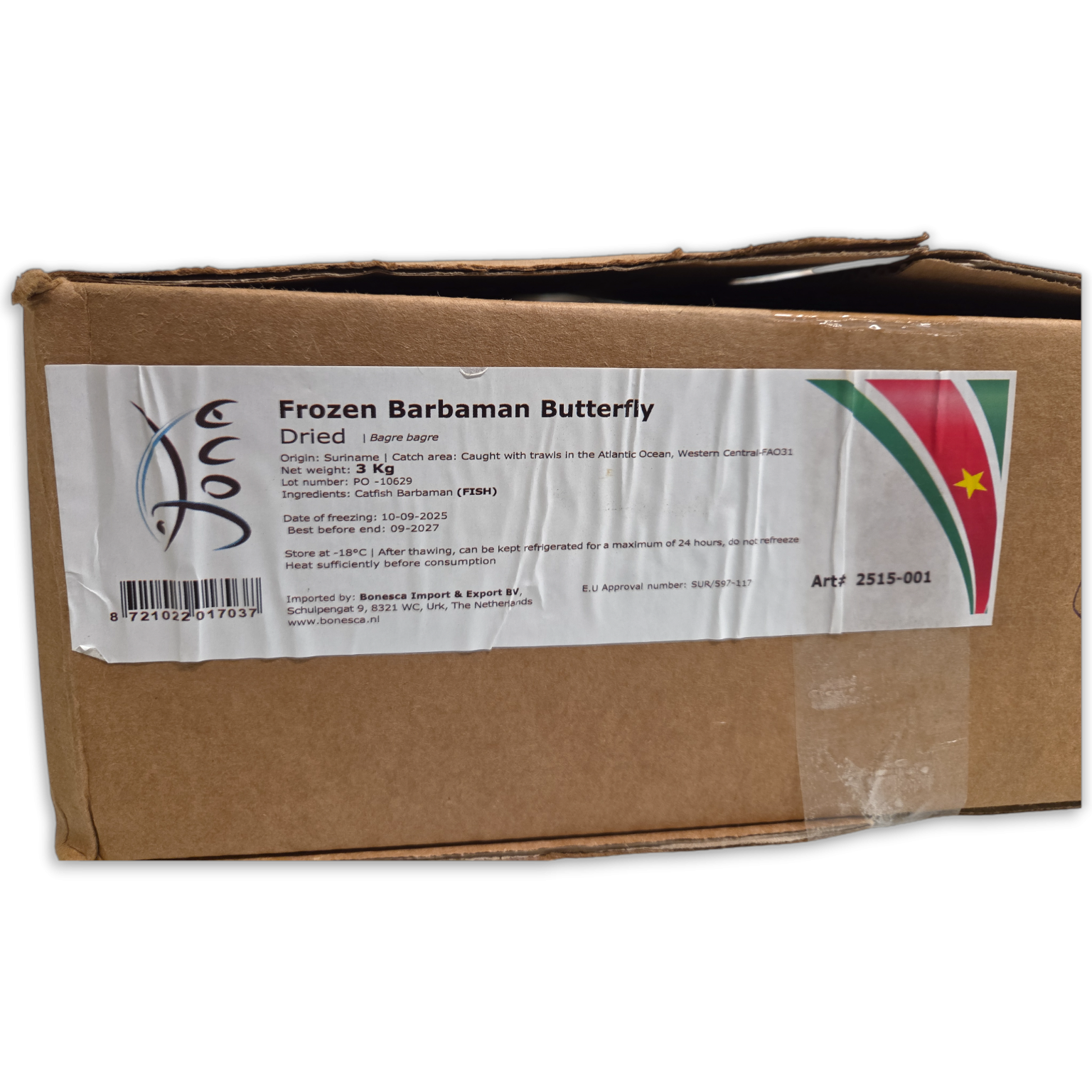 Article number 2515-001 Product Specification 0 Weight 3.00 Consumer Units per box 1 Per pallet 52 Soort Palet EUR Scientific name Bagre Bagre zoekcode 05BAB EAN Code Box 8721022017037 EAN Code Retail 8721022017020 Brand No Statistical code 16041997 Origin Suriname BBD (Batch & Pallet Info) 22/11/2026 (92483-2515-001, EUR, 52) | 17/12/2026 (92525-2515-001, EUR, 48) CU (Consumer Unit) Dimensions 0 SU (Sales unit) Dimensions 59 x 39 x 12cm Common Names No Synonyms No - Reviews