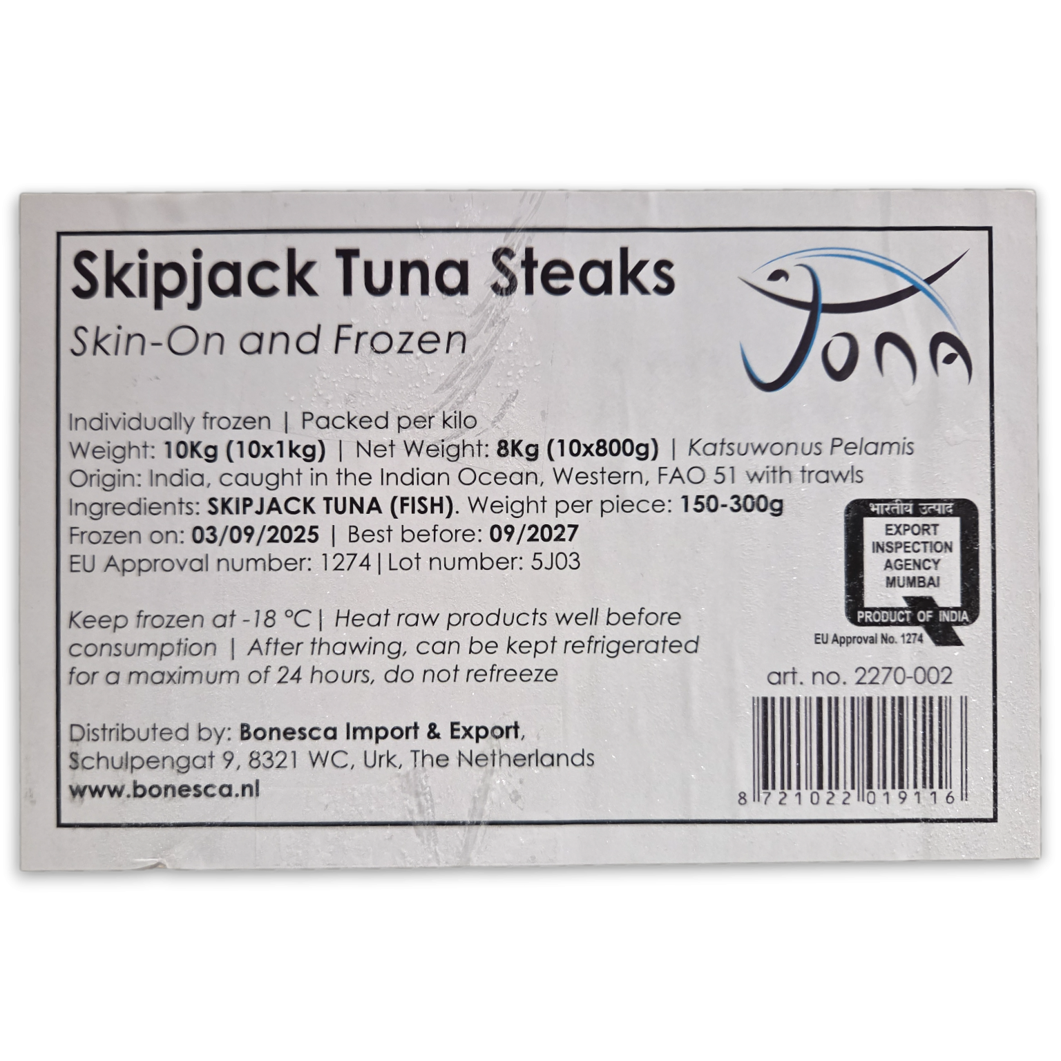 Jona Skipjack Tuna Steaks S/ON 150-300g IQF 10 x 1kg 20% -IN - Additional Information
